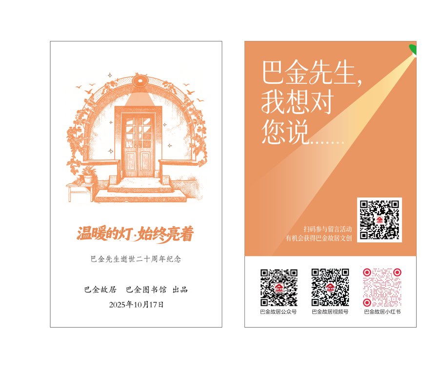 随着灯亮,一张暖橙色的卡片缓缓送出,卡片一面画有巴金故居主楼门口的精美简笔画,游客可以留作纪念;另一面则是“巴金先生我想对您说……”留言二维码,供读者扫码写下对巴金先生的祝福与怀念盈股网配资,生成精美海报可在自媒体分享。精彩留言将被选登在巴金故居公众号上,并获得巴金故居送出的特制文创纪念品。