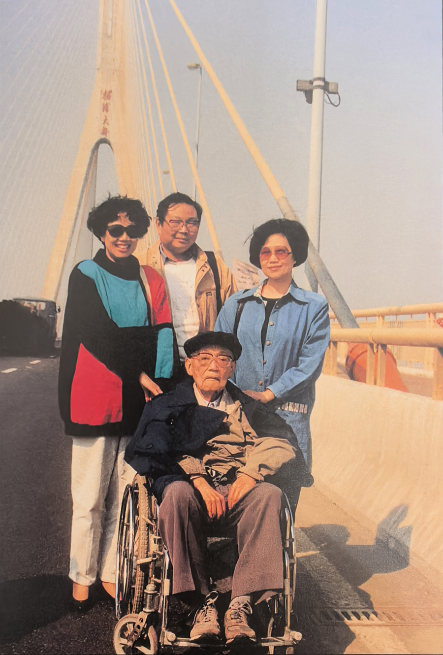 1994年11月2日,巴金与侄女李国煣、女婿祝鸿生、女儿李小林(后排从左至右)参观杨浦大桥。